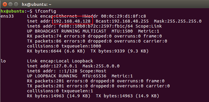 在Linux中通过ifconfig命令查看该Linux的ip地址,如下图所示: