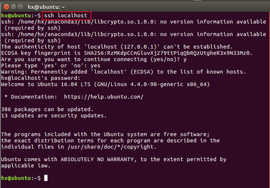 当server安装完成之后,再次执行ssh localhost,执行成功了,如下图所示