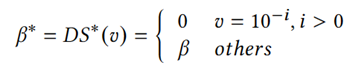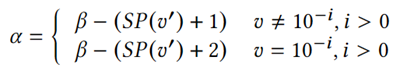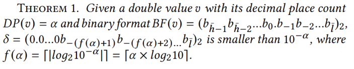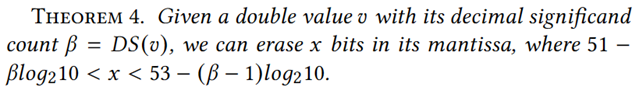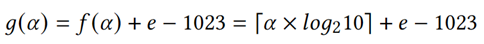 意味着十进制数10-α正好需要f(α)位之后的二进制数来近似表示。根据论文的定理1,v−δ可以认为是在v的二进制格式BF(v)中擦除b-f(α)后面的位。又由IEEE754格式可知,一个双精度浮点数的二进制格式中小数点后的每一位,均能与IEEE754格式中的尾数部分一一对应,且公式为,其中。故BF(v)中b-f(α)对应IEEE754格式中m-g(α),且