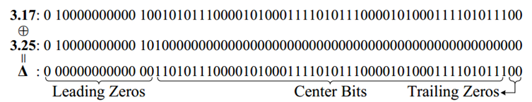 (1)先导零、尾随零和中心位:如图4所示,先导零为XOR结果Δ的底层格式中,第一个1之前的所有零;尾随零为Δ最后一个1之后的所有零;中心位为先导零和尾随零之间的数据。