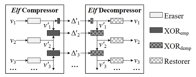 由于被擦除的值v’往往包含长尾零,为了压缩时间序列,论文提出了一种新的基于XOR的压缩器和相应的解压器。