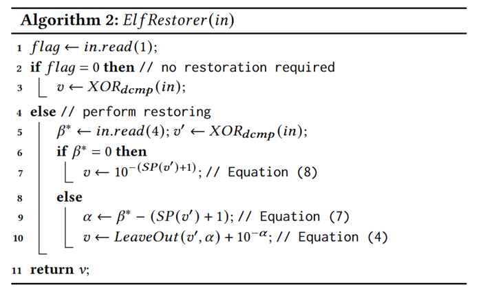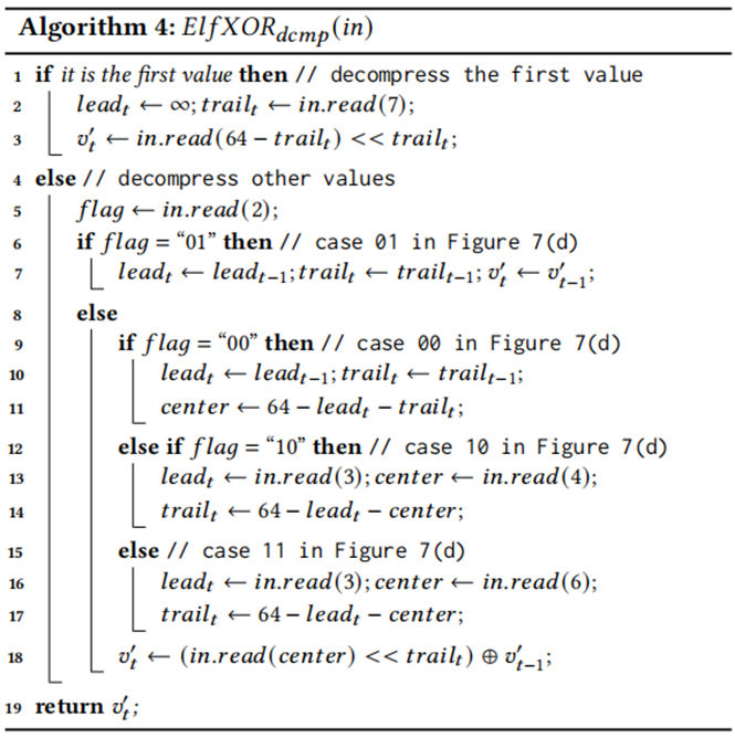 解压缩的过程和与压缩相反。如算法4所示,解压器Elf XORdcmp以输入流in作为输入,在第1-3行中解压缩第一个值,并在第5-17行中分别处理四种不同情况。