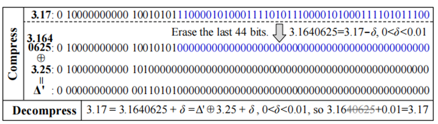 如果这三个条件同时成立(即:β* < 16,δ≠ 0和52 − g(α) > 4),则输出流out写入1位flag“1”,然后写入4位的β*作为v的恢复使用。通过擦除v的最后52 − g(α)位尾数得到v'。否则,输出流out写入1位flag“0”,不做任何修改将v'赋值为v。