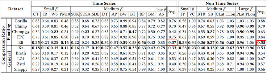 在β不是很大的情况下,Elf压缩算法比经过Elf擦除器优化过的Gorilla和Chimp算法甚至提高了8.7% ~ 33.3%,由此验证了XORcmp优化策略的有效性。
