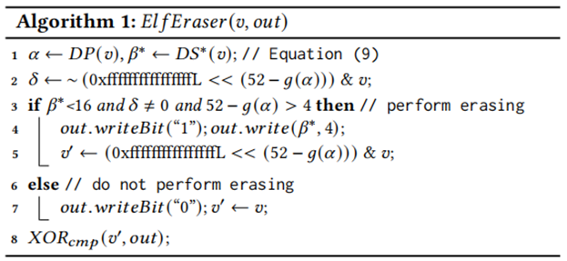 (2)擦除算法:算法1给出了尾数擦除过程的伪代码。算法使用1bit作为标志来指示是否擦除了v,将双精度值v和输出流out作为输入。首先,计算小数位数α和修正后的有效值位数β*,并通过提取v的最后52 − g(α)位尾数位得到δ。
