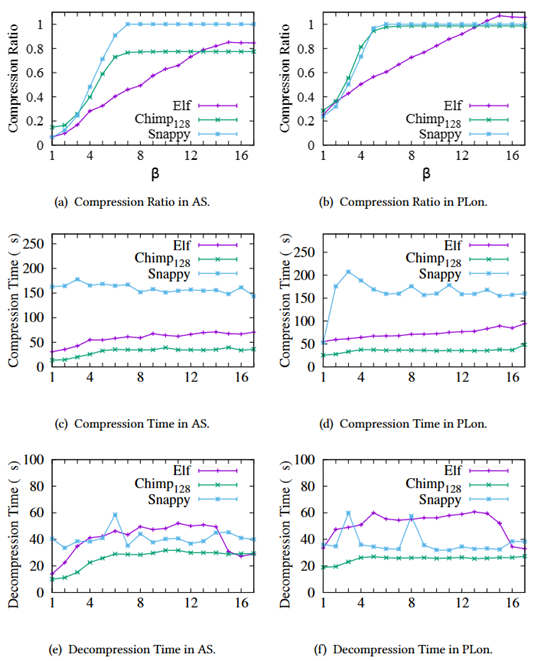 如图8所示,β在3和13之间时,Elf总是保持最好的压缩率。当β= 6时,Elf相对于Chimp128和Snappy的压缩率增益最高。对于不同的β,Elf的压缩时间比Chimp128稍长,但比Snappy短得多。虽然Elf的解压时间大约是Chimp128的两倍,但始终小于60μs。