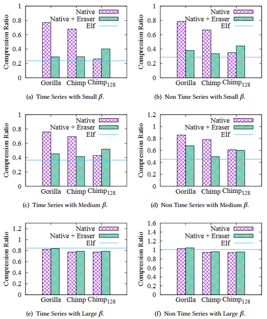 如图9所示,对于β较小或中等的数据集,擦除策略都可以显著提高Gorilla和Chimp的压缩率,但Chimp128几乎不能从擦除策略中受益。对于β较大的数据集,Elf擦除器不能增强基于XOR的压缩器的压缩率。