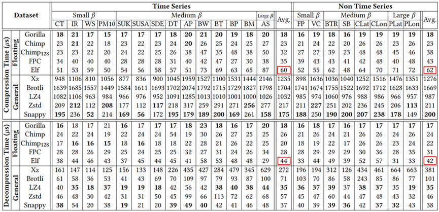 从图6实验结果观察可知,相比无损浮点压缩算法,Elf在几乎所有的数据集上都有最好的压缩率,无论是时间序列数据集,还是非时间序列数据集,其中对于时间序列数据集,Elf的压缩率相对于Gorilla和FPC平均相对提高了51%,并分别比Chimp和Chimp128获得47%和12%的相对改善;Elf与通用压缩算法在压缩率上旗鼓相当,甚至相比LZ4和snappy有明显优势;而对于large β的数据集,所有压缩算法的压缩率均不理想。