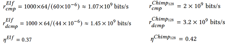 ,当传输速率rtr小于6.17 × 107bits/s时,Elf的总体性能优于Chimp128。在典型的CS架构中,一个连接的带宽很少超过6.17 ×107bits/s,且对于每个连接,Chimp128将分配33KB的内存,这对于高并发场景是负担不起的。