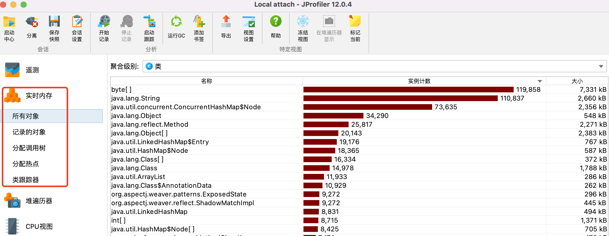 - 所有对象:包含名称、大小、个数,可以点击“标记当前”,跟点击时间点进行对比