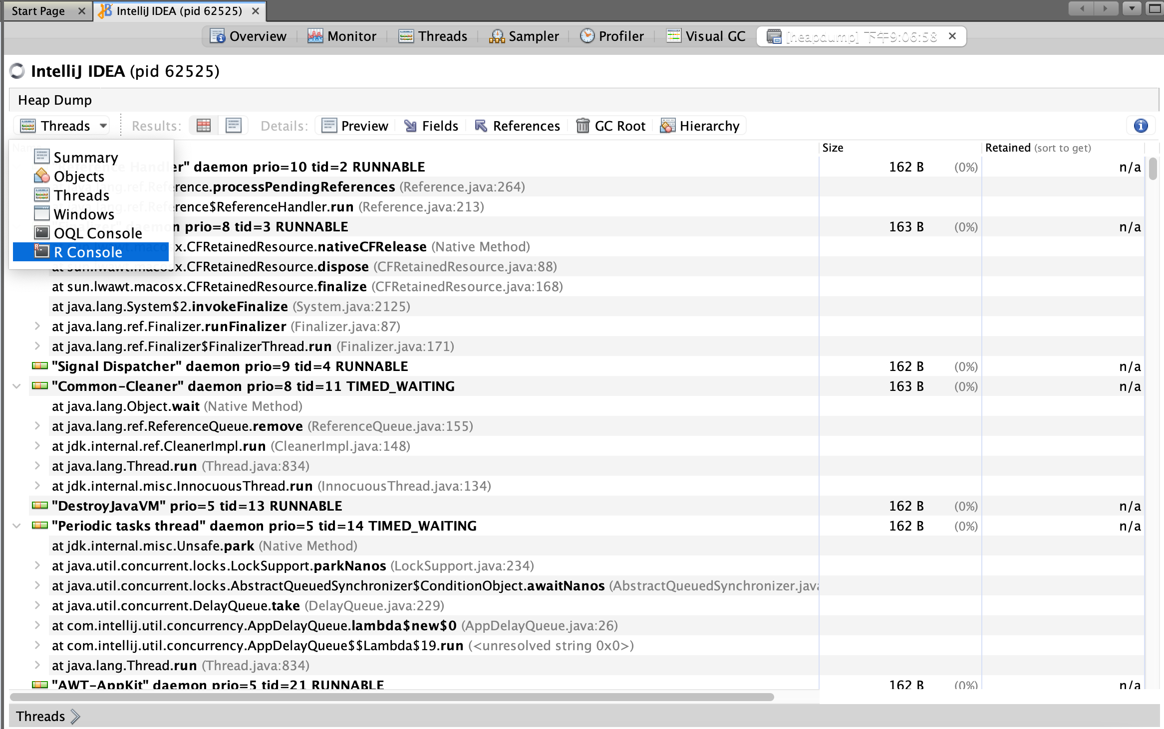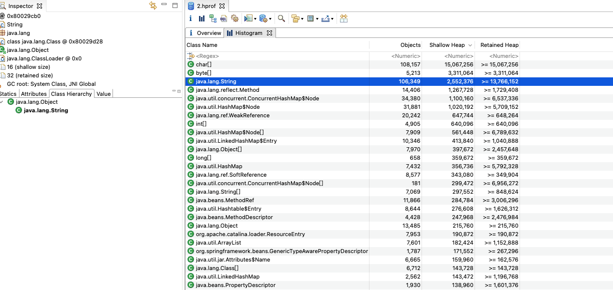 - retained heap:深堆,对象保留集中所有对象的浅堆之和,也就是对象回收后可以释放的真实空间
