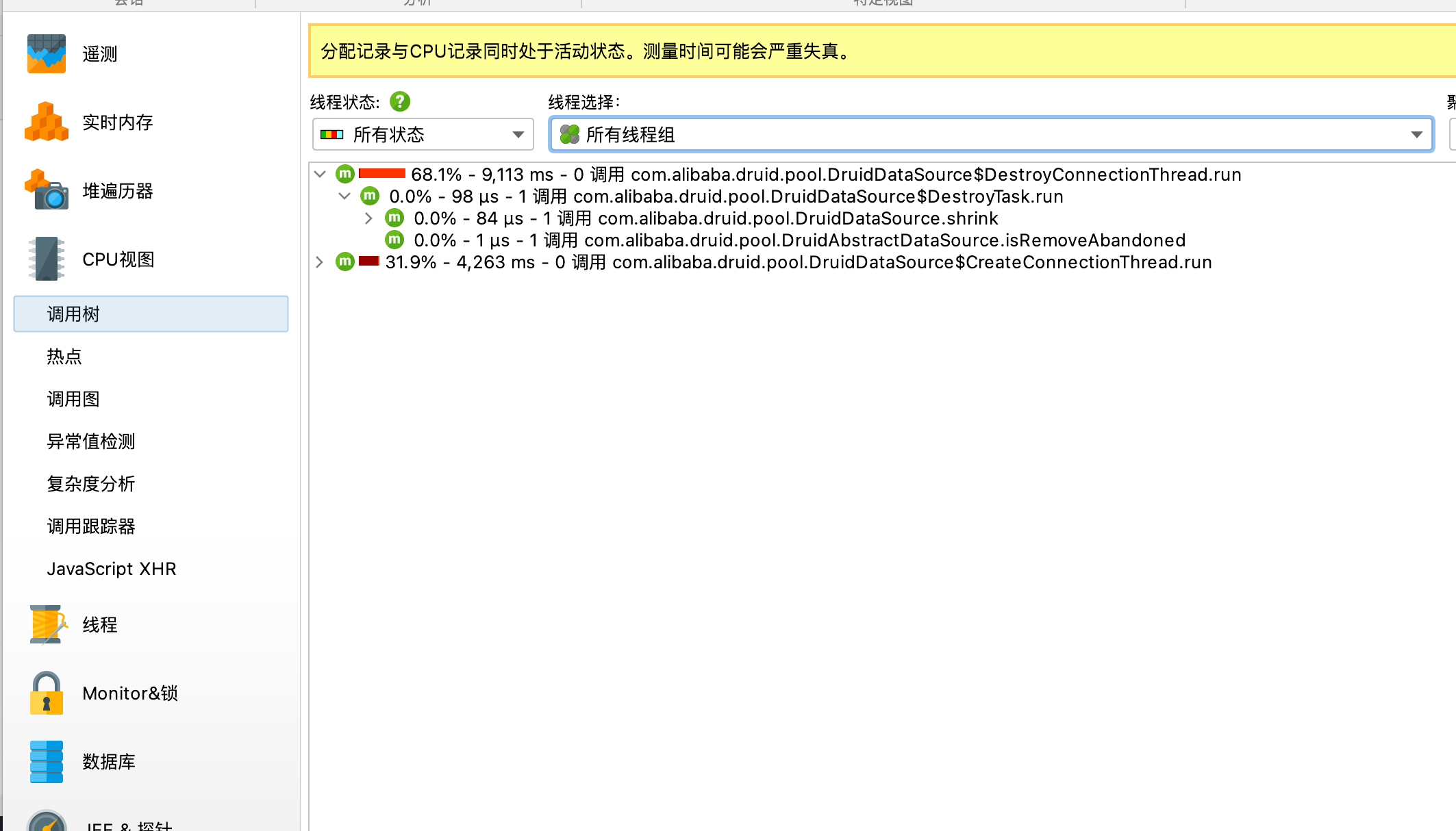 - 分配调用树:显示一个请求树或者方法、类、包或对已选择类有逮住是的饭呢佩信息的J2EE组件
