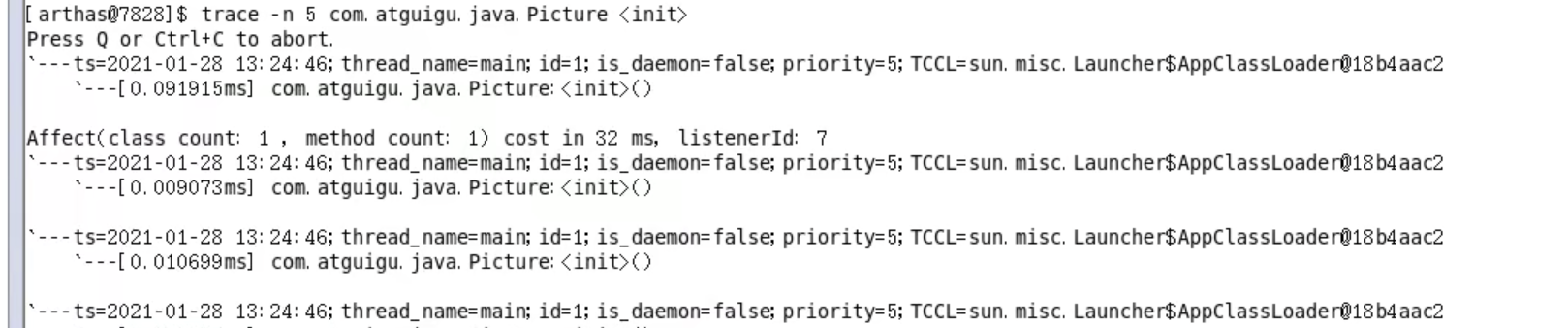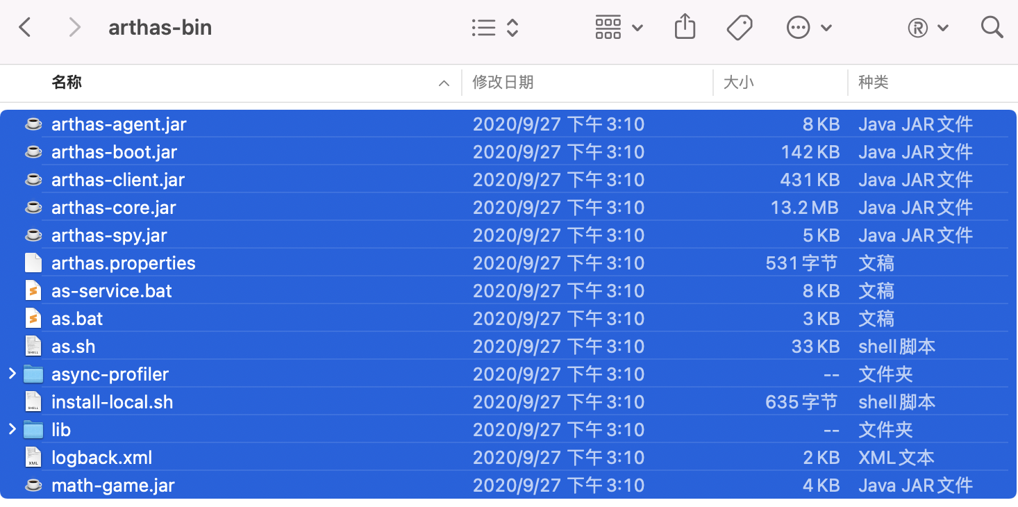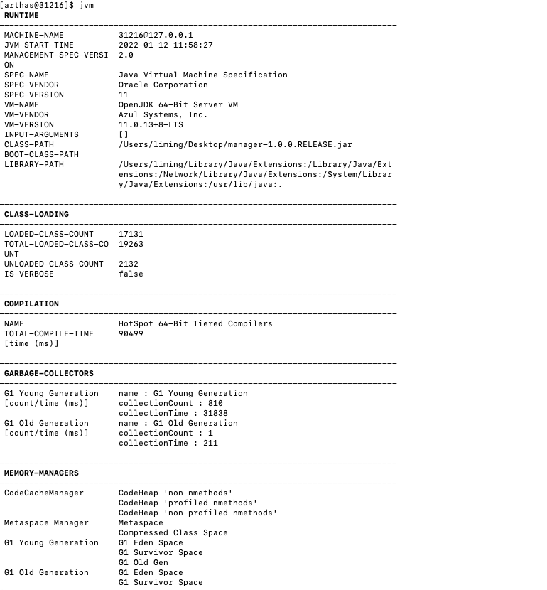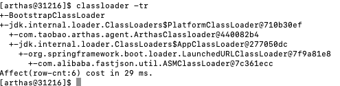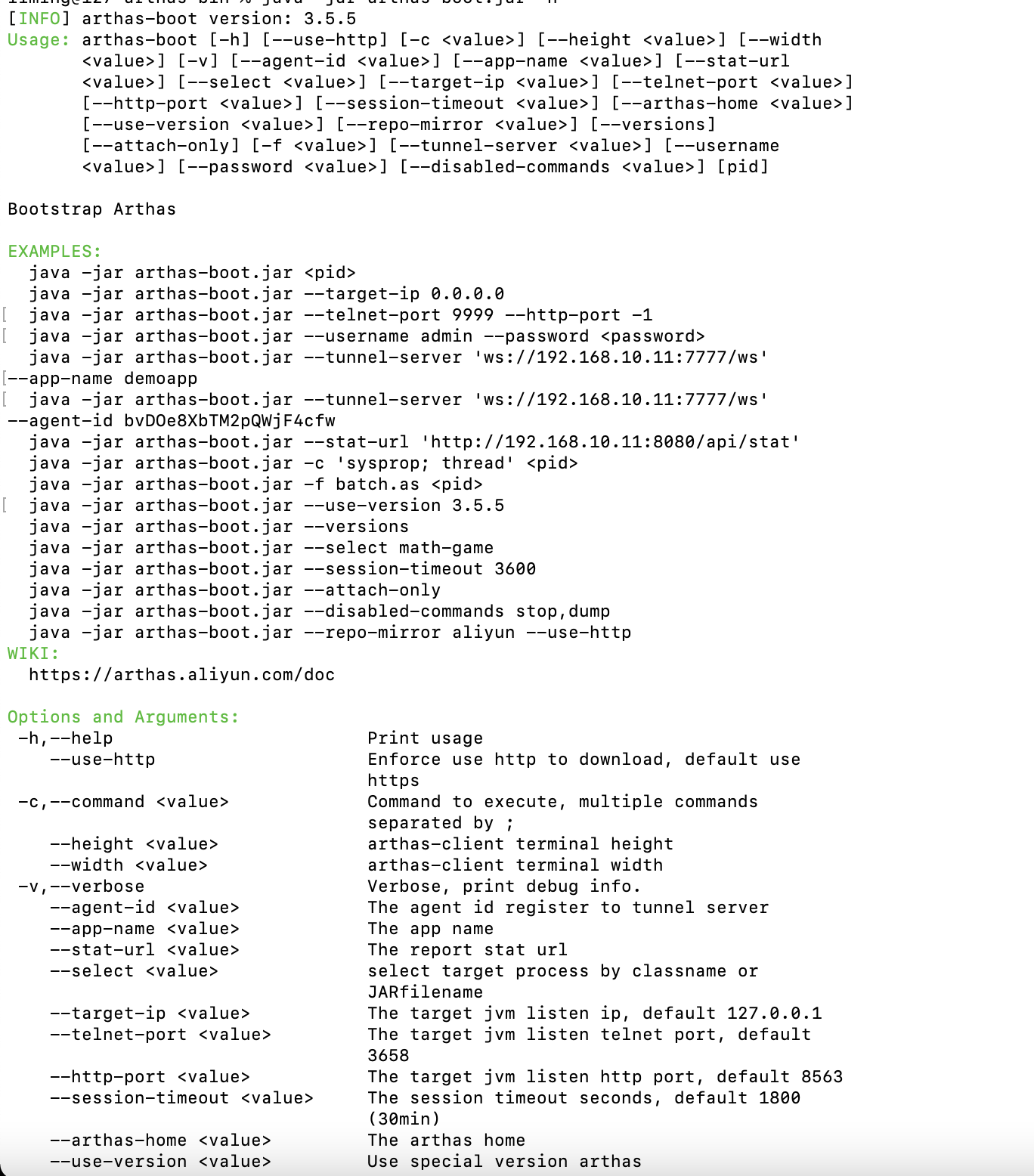 查看日志:cat ~/logs/arthas/arthas.log,也可以使用 java -jar arthas-boot.jar -h 查看帮助文档。