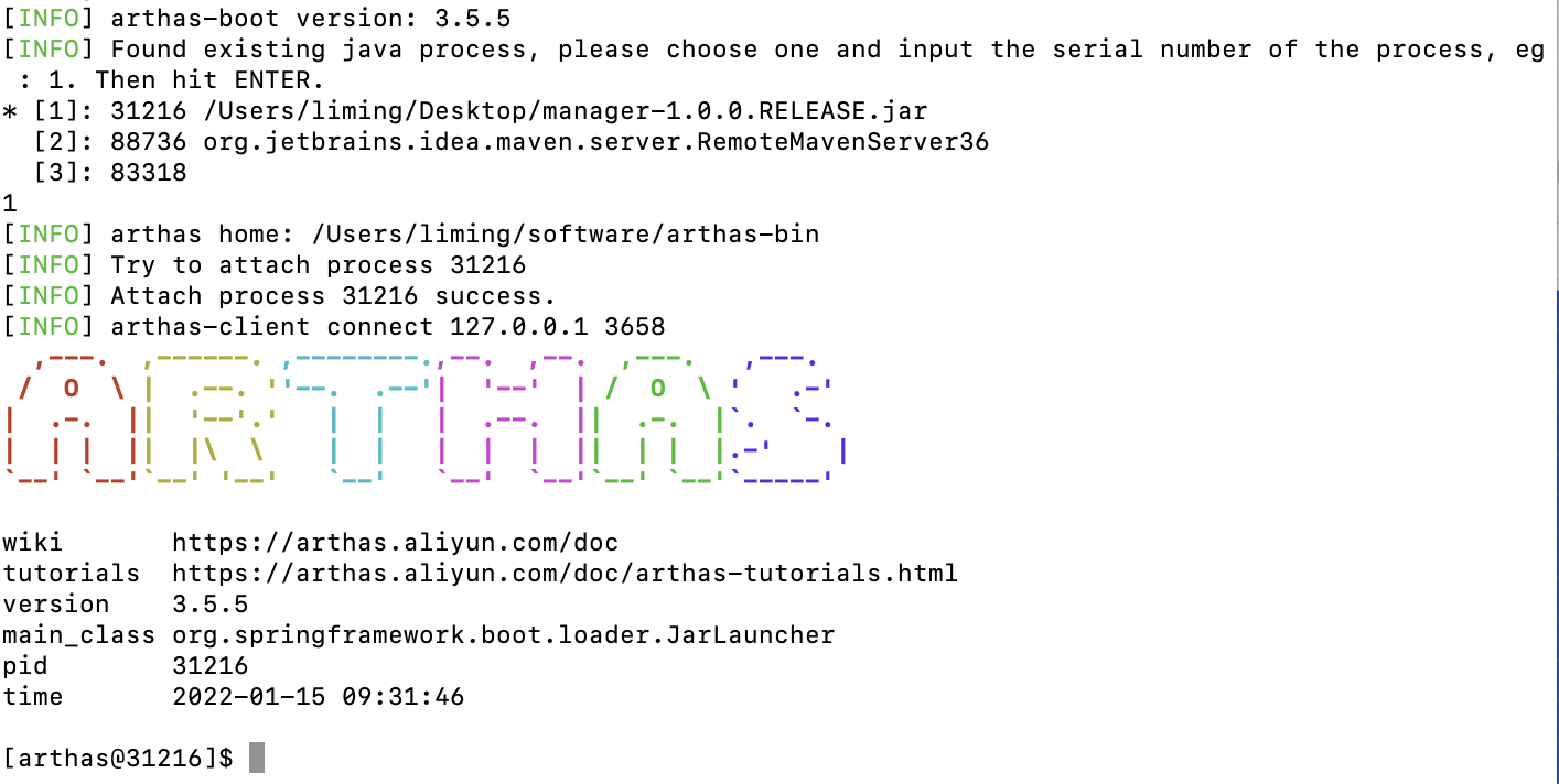 直接启动 arthas-boot.jar即可,启动后选择一个进程去监控,也可以直接跟着PID监控指定进程: