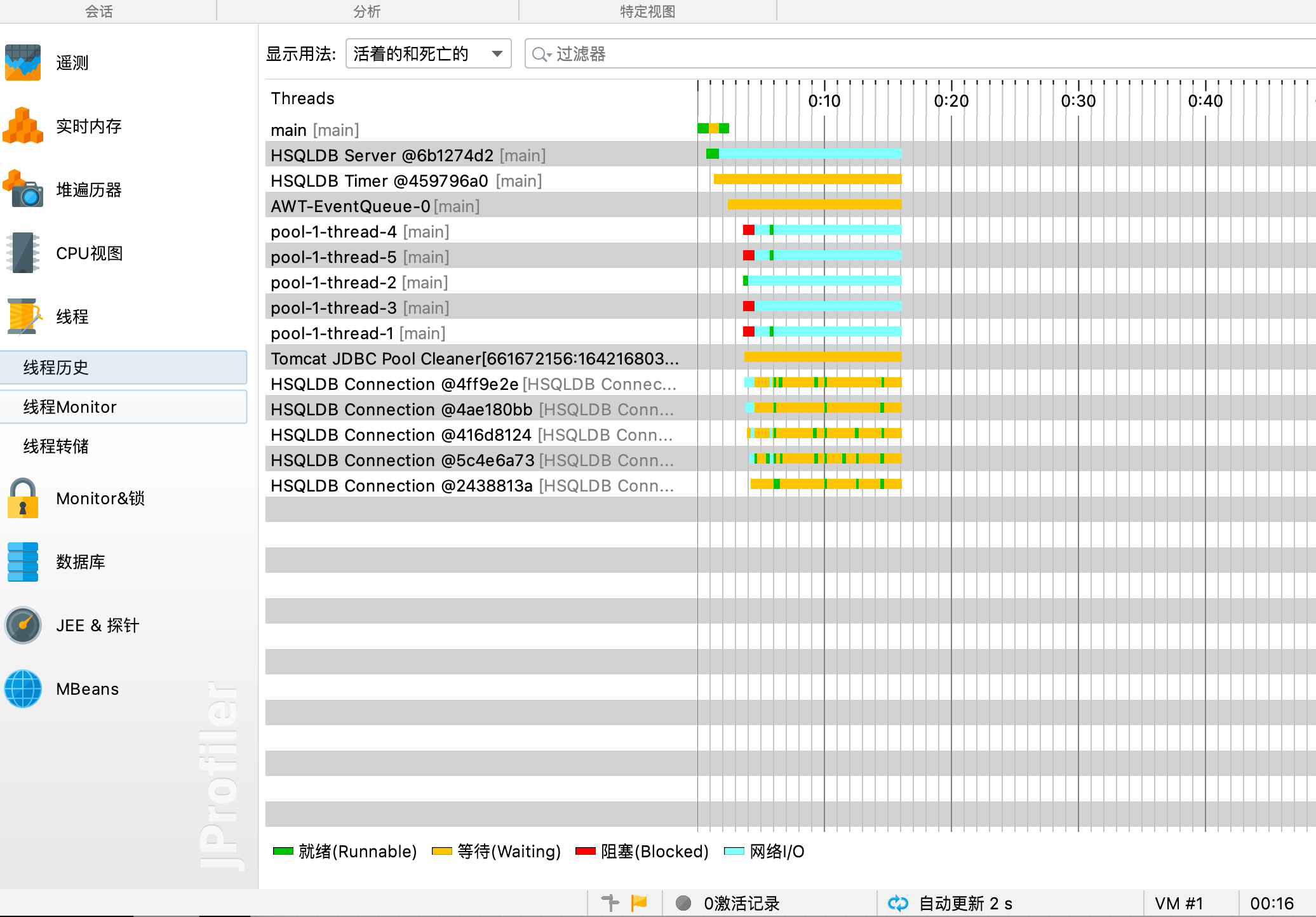 - 线程历史:显示一个与线程活动和线程状态一起的活动时间表