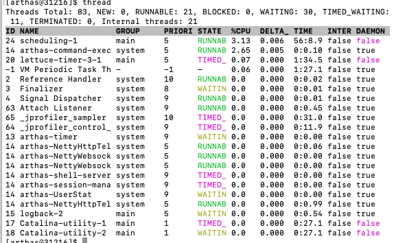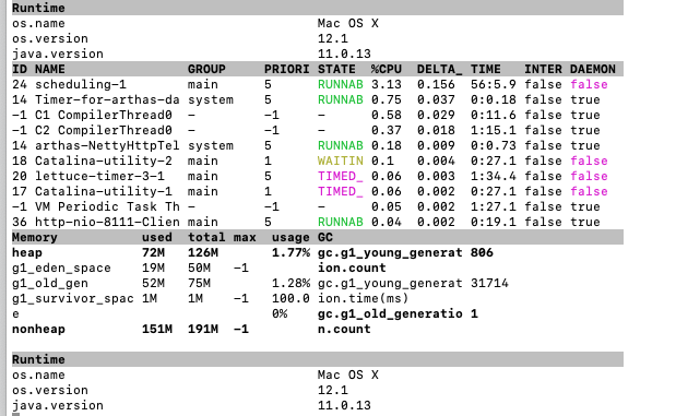 - thread,查看线程情况,可以根据线程ID查询详情,-b 参数是查看是否有死锁,-i 统计时间段内线程cpu使用率, -n 查询cpu使用率最高的几个线程