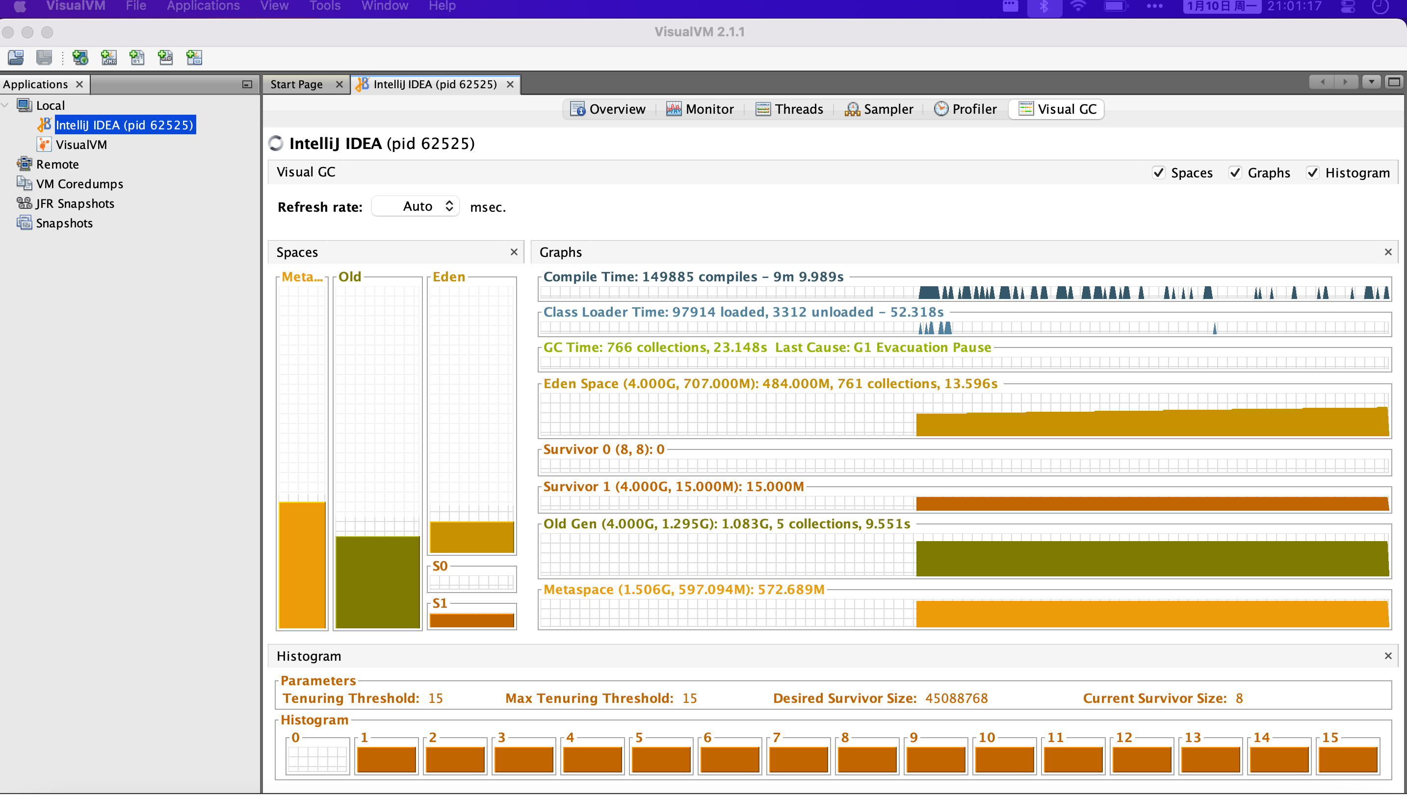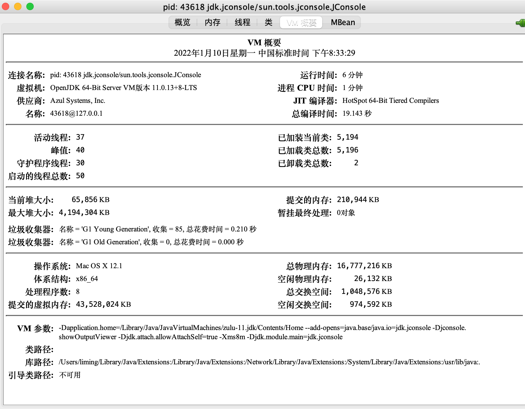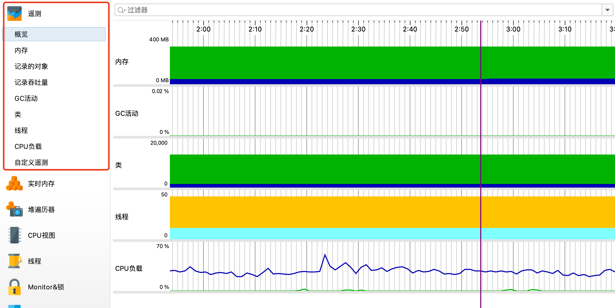 对整个监控应用的一个概览,上面能够看到内存、类、GC等相关内容