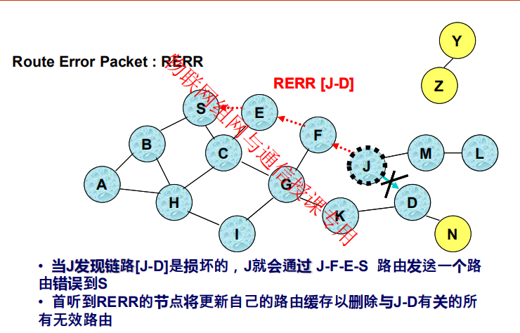 - 产生路由错误消息(RERR)会向前继发送