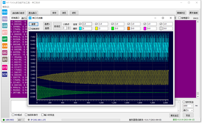 - 按下按键K2,打印测试波形2和滤波后的波形数据。