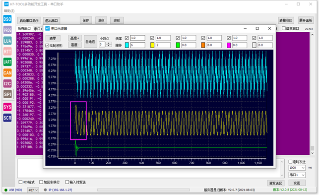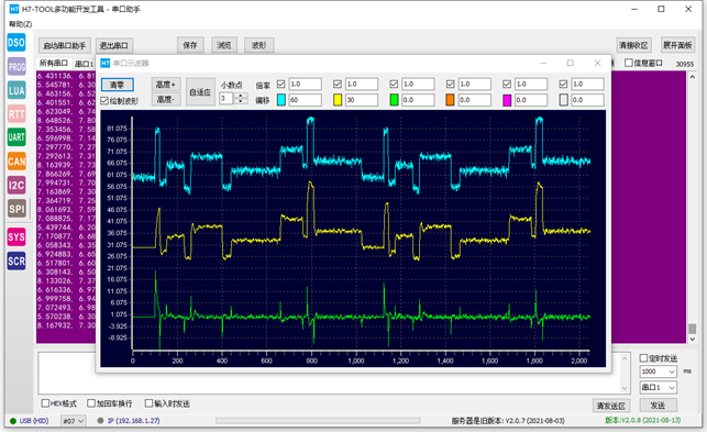 - 按下按键K1,打印测试波形1和滤波后的波形数据。