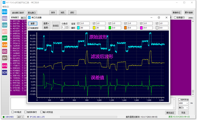 - 按下按键K3,打印测试波形3和滤波后的波形数据。