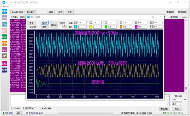 * 功能说明: 原始波形200Hz + 50Hz正弦波,滤除200Hz正弦波。
