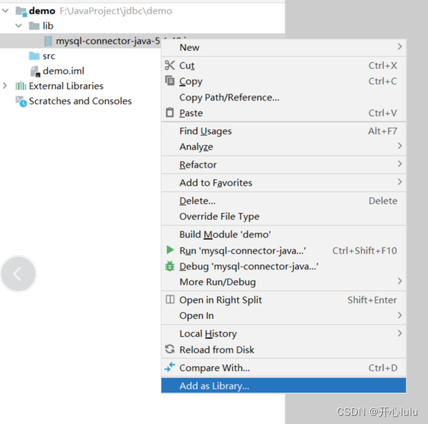 1、把mysql驱动jar包复制到lib目录下,然后选中驱动jar包右击,选择 Add as Library...