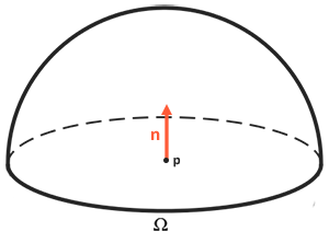 基于反射率公式是围绕所有入射辐射率的总和,也就是辐照度来计算的,所以我们需要计算的就不只是是单一的一个方向上的入射光,而是一个以点[Math Processing Error]p为球心的半球领域[Math Processing Error]Ω内所有方向上的入射光。一个半球领域(Hemisphere)可以描述为以平面法线[Math Processing Error]n为轴所环绕的半个球体: