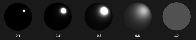 我们可以看到,较高的粗糙度显示出来的镜面反射的轮廓要更大一些。与之相反,较小的粗糙度显示出的镜面反射轮廓则更小更锐利。