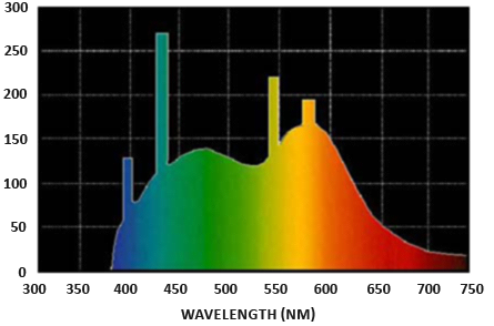 辐射通量:辐射通量[Math Processing Error]Φ表示的是一个光源所输出的能量,以瓦特为单位。光是由多种不同波长的能量所集合而成的,而每种波长则与一种特定的(可见的)颜色相关。因此一个光源所放射出来的能量可以被视作这个光源包含的所有各种波长的一个函数。波长介于390nm到700nm(纳米)的光被认为是处于可见光光谱中,也就是说它们是人眼可见的波长。在下面你可以看到一幅图片,里面展示了日光中不同波长的光所具有的能量: