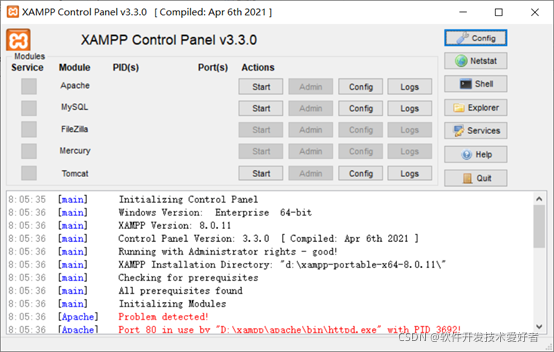 【可能遇到的问题:安装XAMPP遇到的端口被占用导致apache和MySQL无法启动的处理 安装XAMPP遇到的问题(二)——端口被占用导致apache和MySQL无法启动_小科粒的博客-CSDN博客