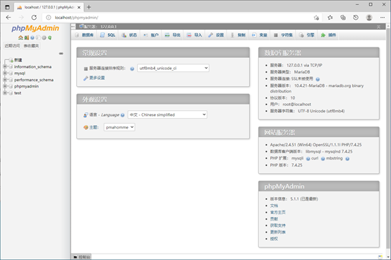 点击上图所示页面右上角的“phpMyAdmin”,可以进入数据库管理页面: