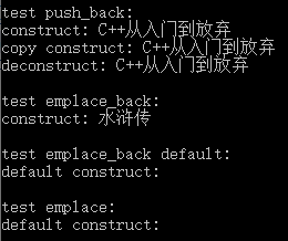 {//测试vectorstd::vector<SBook> books;// 预先分配,否则整个vector在容量不够的情况下重新分配内存books.reserve(100);std::cout << "test push_back:" << std::endl;books.push_back(SBook("C++从入门到放弃", 1));std::cout << std::endl;std::cout << "test emplace_back:" << std::endl;books.emplace_back("水浒传", 2);std::cout << std::endl;std::cout << "test emplace_back default:" << std::endl;books.emplace_back();auto& book = books.back();book.bookName = "红楼梦";book.price = 5;std::cout << std::endl;std::cout << "test emplace:" << std::endl;auto it = books.emplace(books.end());it->bookName = "西游记";it->price = 3;std::cout << std::endl;//std::cout << "output all books: " << std::endl;//for_each(books.begin(), books.end(), [](const SBook& book)->void// {// std::cout << book.bookName << std::endl;// });//std::cout << std::endl; // 测试setstd::set<SBook> bookSet;std::cout<< "test bookSet insert:" << std::endl;bookSet.insert(SBook("十万个为什么", 1));std::cout << std::endl;std::cout << "test bookSet emplace:" << std::endl;bookSet.emplace("新华字典", 2);std::cout << std::endl;//std::cout << "output bookset: " << std::endl;//for_each(bookSet.begin(), bookSet.end(), [](const SBook& book)->void// {// std::cout << book.bookName << std::endl;// });//std::cout << std::endl;return 0;