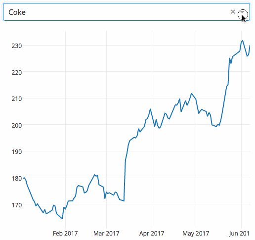 Dash的出现让为数据分析代码构建GUI这项工作变得超级简单。下面的例子是一个将下拉菜单与支持D3.js的Plotly图形绑定的Dash应用。用户点击下拉菜单选择不同的值,程序代码就能动态地从谷歌金融导入数据到Pandas的DataFrame。这个应用仅用了43行代码,简单吧!