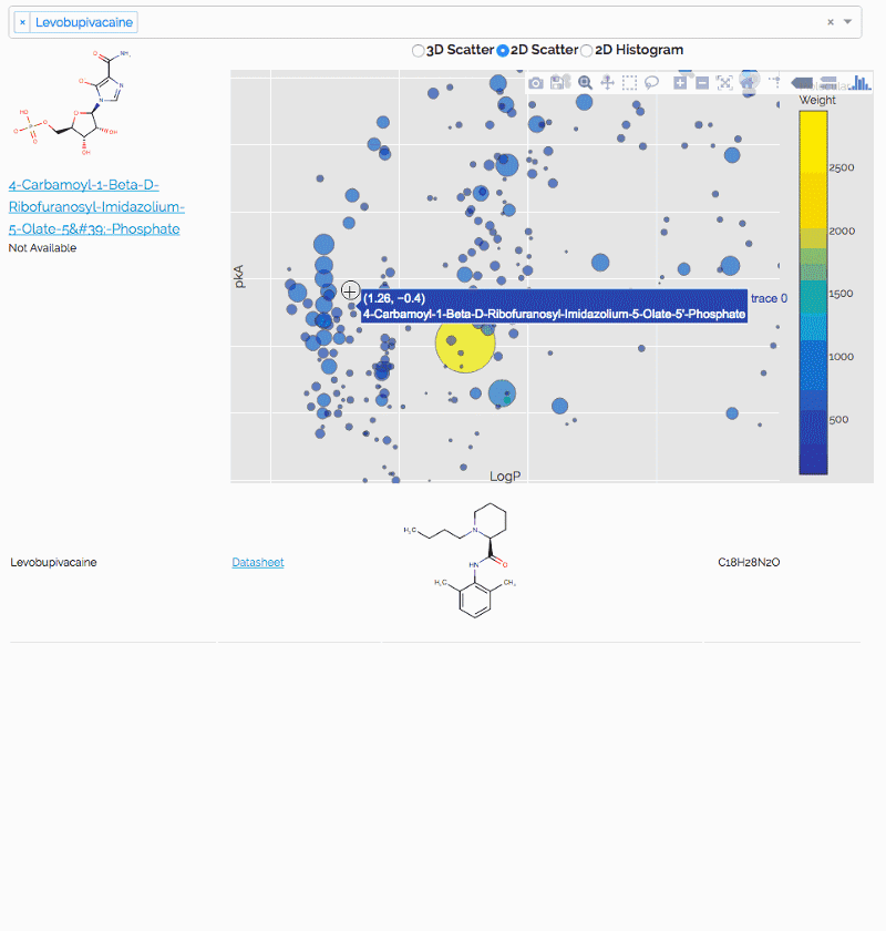 分析药品的Dash应用。鼠标悬停在点上时显示药品的描述,在下拉菜单中选择时,会高亮显示药品在视图中的位置,并向下方的表格添加该药品的标识。实现此功能仅需几百行Python代