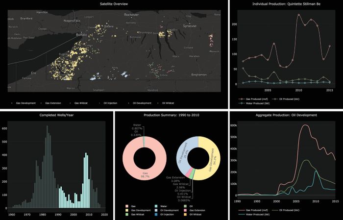Dash应用的代码是声明与反应式的,可以轻松构建包含交互元素的复杂应用。下面是一个包含5个输入项,3个输出项和交叉筛选的例子,这个例子只有160行代码,并且都是用Python编写的。