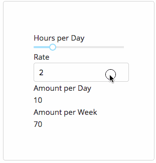 app.layout = html.Div([html.Label('Hours per Day'),dcc.Slider(id='hours', value=5, min=0, max=24, step=1), html.Label('Rate'),dcc.Input(id='rate', value=2, type='number'), html.Label('Amount per Day'),html.Div(id='amount'), html.Label('Amount per Week'),html.Div(id='amount-per-week') ]) @app.callback(Output('amount', 'children'),[Input('hours', 'value'), Input('rate', 'value')]) def compute_amount(hours, rate):return float(hours) * float(rate) @app.callback(Output('amount-per-week', 'children'),[Input('amount', 'children')]) def compute_amount(amount):return float(amount) * 7