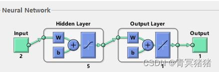 1、这是神经网络的一个界面,这是一个2输入1输出,5个隐含层的BP网络,称为2-5-1网络结构(另外输入、隐层、输出的数量可以根据实际情况自行调整)