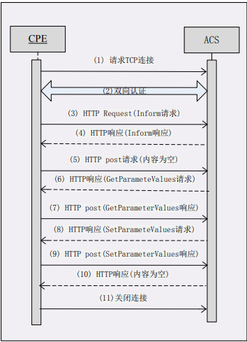 - 会话的概念:所有的通信和操作都在配置会话的范围内进行。会话是由设备从一个通知(Inform)消息的传输开始的。ACS 服务器在收到通知消息时,开始对 CPE 调用接口方法进行状态查 询和配置。认证对于 CPE 来说是必不可少的,一般采用摘要认证算法来对 CPE 进行认证
