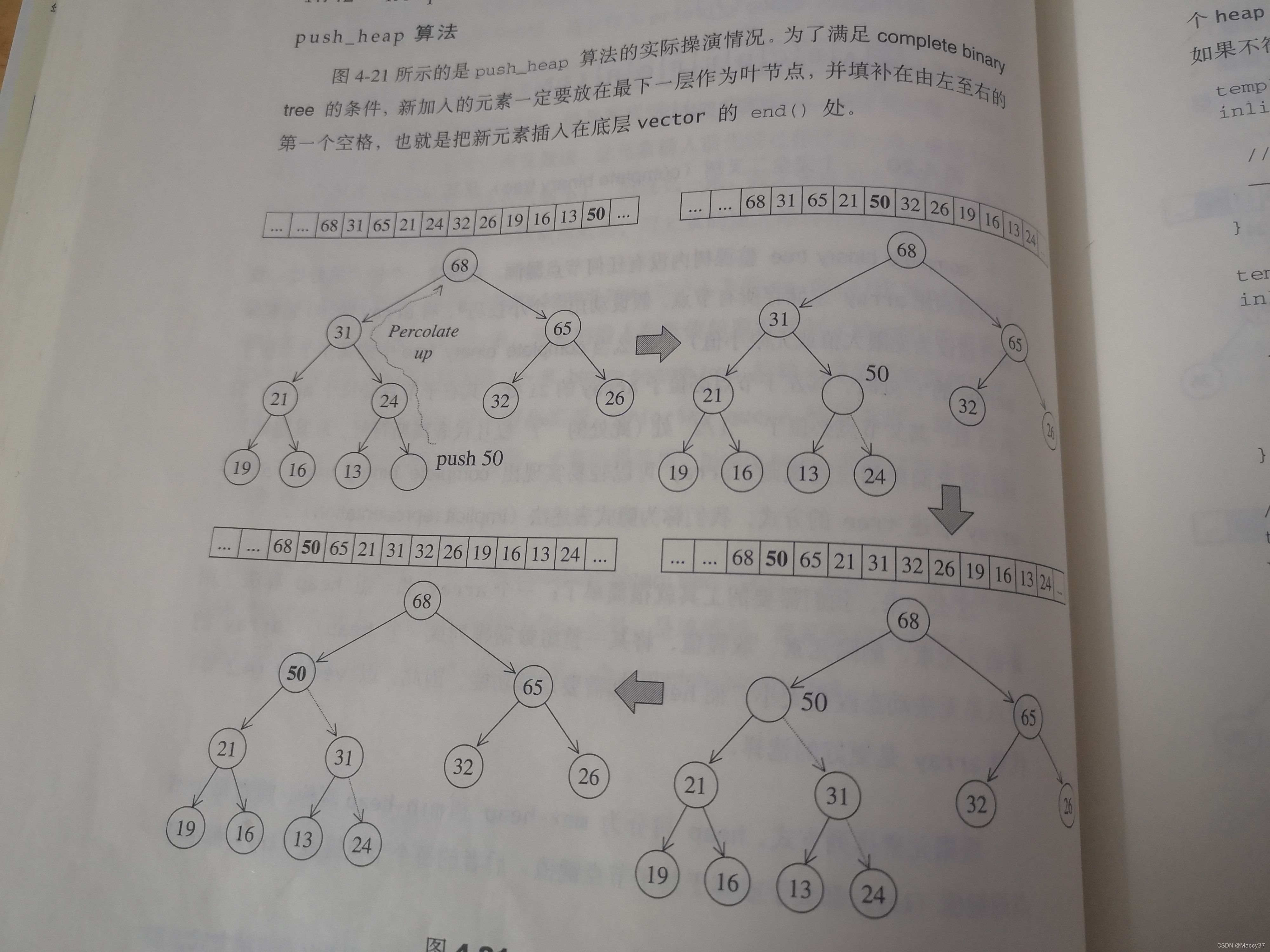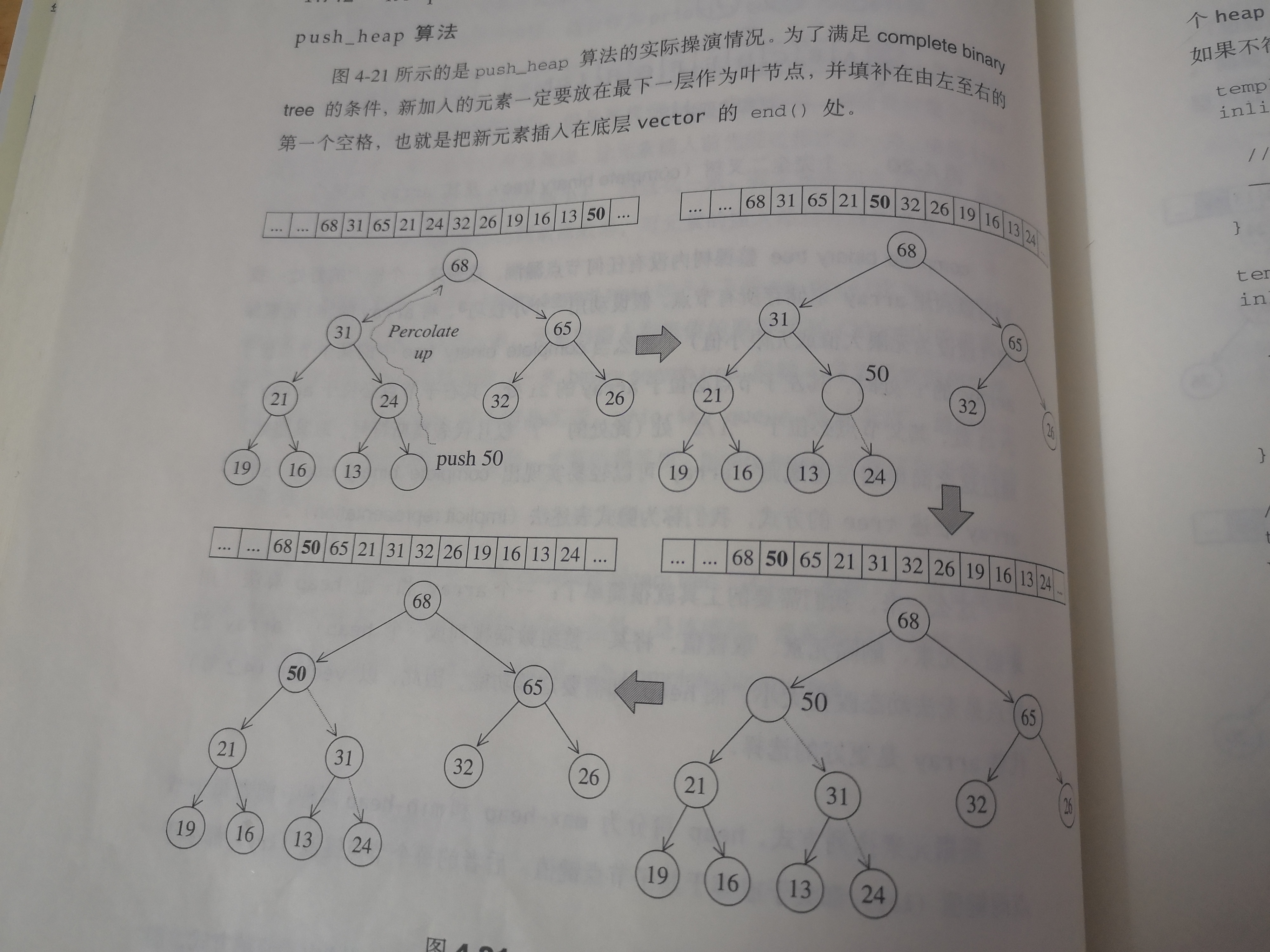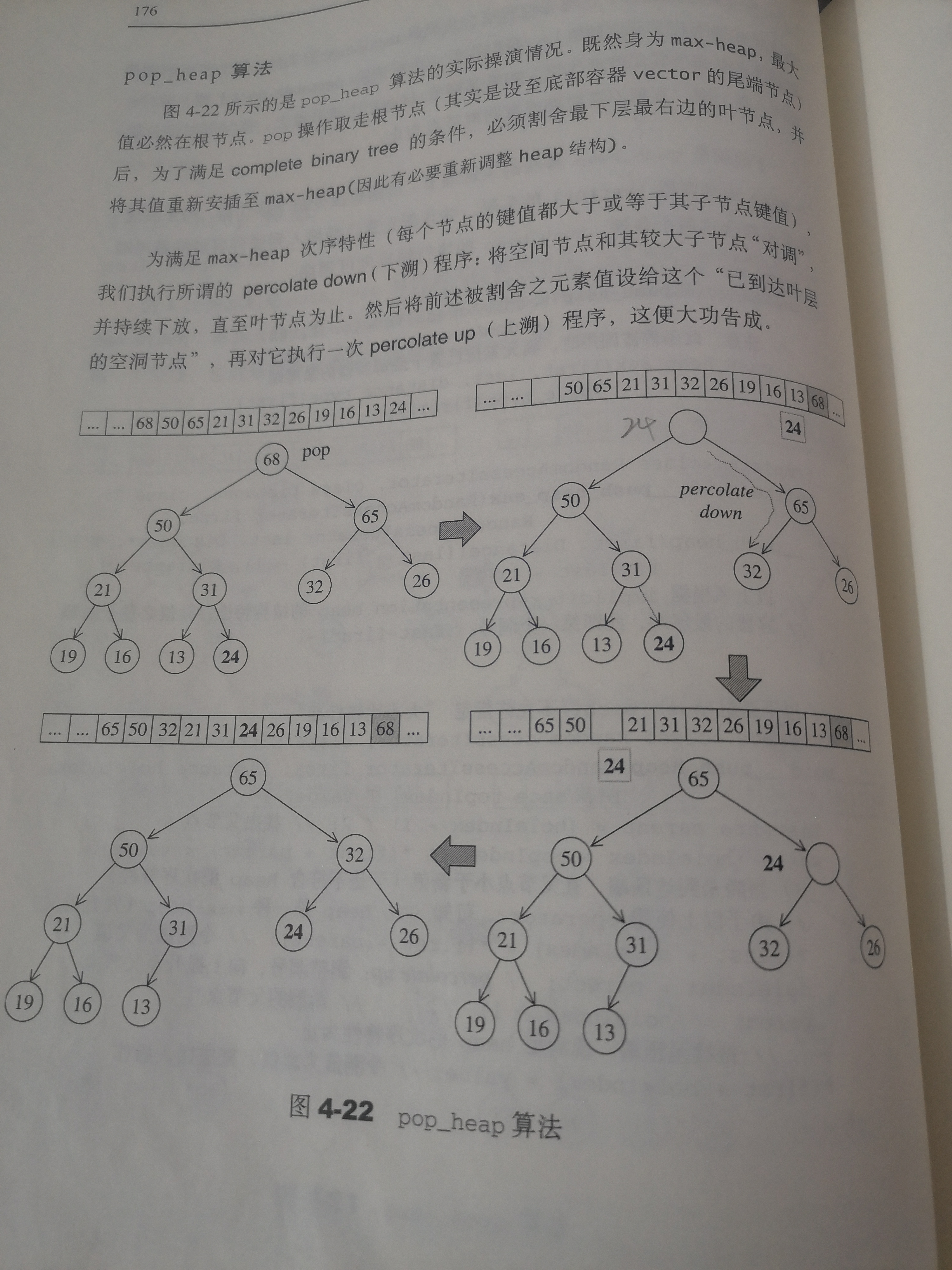pop_heap()取走根节点,将它放到堆最末尾,割下最下层最右边的叶子节点,并将其放置max-heap根节点位置,然后将根节点元素下溯,将该节点和其较大子节点“对调”,持续下放直到叶子节点为止。(下溯原则:max-heap每个节点的键值都大于或者等于子节点键值;min-heap每个节点的键值都小于或者等于子节点键值)