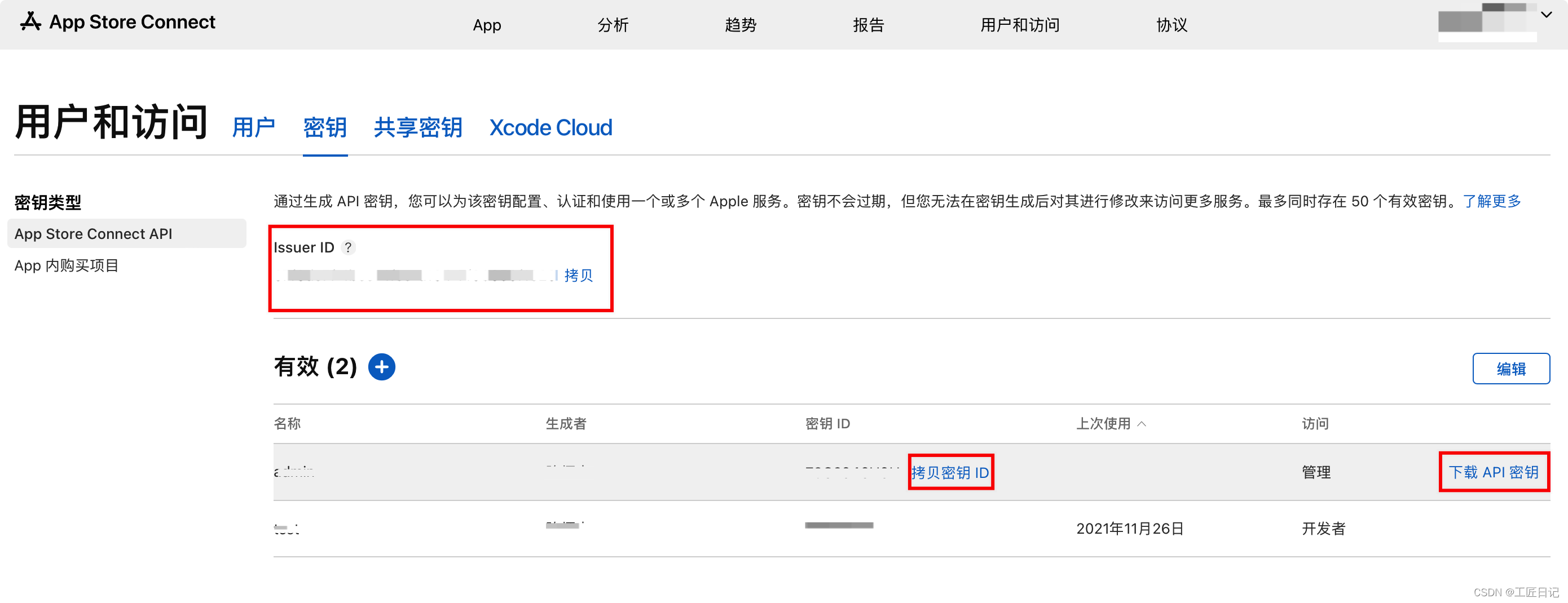 创建认证令牌的发放者。导航到 App Store Connect API,Issuer ID下面的字符串即是。