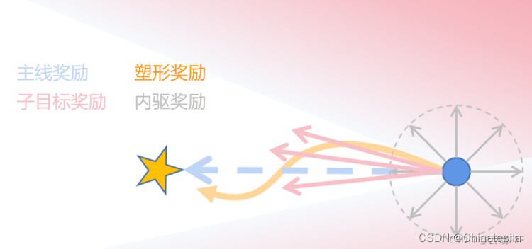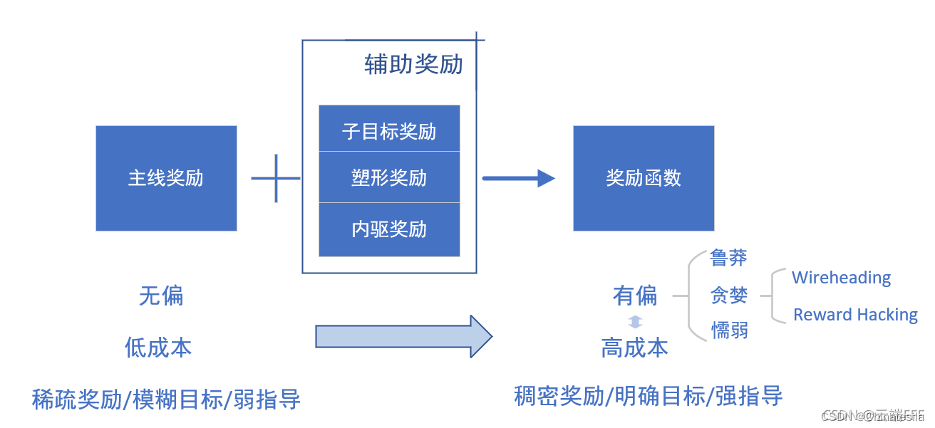 主线事件:强化学习的任务目标通常可以分为两类1、定性目标,如下棋获胜,游戏通关。2、定量目标,收益最大化或者消耗最小化主线奖励:根据主线事件可以相应地定义主线奖励1、定性任务,可以在目标达成时给奖励2、定量任务,依据本身或者它的某种度量给奖励但如果只使用主线奖励,往往导致稀疏奖励问题当任务复杂时,仅仅依靠主线奖励无法明确的指导模型的训练,导致盲目探索,算法难以收敛。