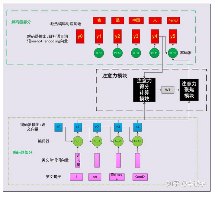 注意力机制(Attention Mechanism)是人们在机器学习模型中嵌入的一种特殊结构,用来自动学习和计算输入数据对输出数据的贡献大小。本文以一个基于注意力机制的机器翻译模型为例,从人的直觉、中英文翻译的常识、特征工程等角度,对注意力机制的思想和机理进行了阐述;并介绍了一种常见的注意力机制实现形式,即基于感知机的注意力机制;还介绍了一种比较经典的注意力机制,即自注意力机制(self-attention)解释:数据处理的一种方式,有选择性的处理信号,即对接收到的数据,选择性的关注其中一部的特征,而不是全部。特征工程:模型外部的注意力机制对原始的特征进行筛选,得到一个高质量的特征子集,这样可以帮助模型选择最有效,适当规模的特征。深度学习领域的注意力机制目的,让模型学会为输入的各个维度打分,然后按照得分对特征加权,以突出重要特征对模型后续部分模块的影响。接下来以一个循环神经网络为例子,介绍注意力机制的运用,这是没有注意力机制时的情况编码器最后生成z4而解码器部分只以z4和y序列的输出来得到最后结果,这在某些情况下时不合理的,忽略了相关性的因素。例如在翻译的过程中,从前到后,I对应我,此时不需要考虑到后续的输入,因此,直接使用z4是不是不合理呢,而中国人的人字就需要综合考虑前面的所有输入以及输入翻译得到的结果。这里使用注意力机制做了什么呢,其实就是计算了编码器和解码器在各个时间步的输出的相关度。