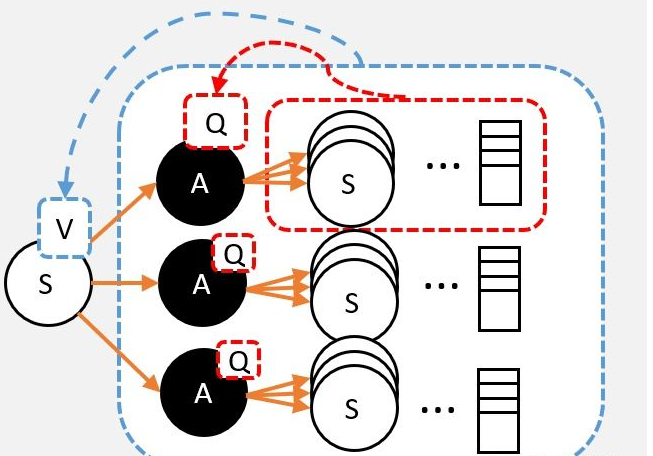 奖励函数时目标累计的一个子元素收益/奖励是智能体目标的一种形式化、数值化的表征, 智能体所有的 “目标” 或 “目的” 都可以归结为:最大化智能体收到的标量奖励信号的累计和(称之为“收益”)的概率期望值 —— Richard S.Sutton 收益是通过奖励信号计算的,而奖励函数是我们提供的,奖励函数起到了人与算法沟通的桥梁,奖励函数对于强化学习来说相当于模型训练的指导者。强化学习的Q值、V值、奖励首先有一个马尔可夫链,包括状态集合,每个状态对应的动作集合,状态转移举着,每个动作的奖励R,奖励可能是正的也可能是负数。Q值,评估动作的价值, 它代表了智能体选择这个动作后,一直到最终状态奖励总和的期望V值,评估状态的价值, 它代表了智能体在这个状态下,一直到最终状态的奖励总和的期望而我们后续所有地工作都是未来找到最准确地Q值或者V值,以便我们选择最适宜地策略。V和Q可以互相换算:用Q值换算V值:
