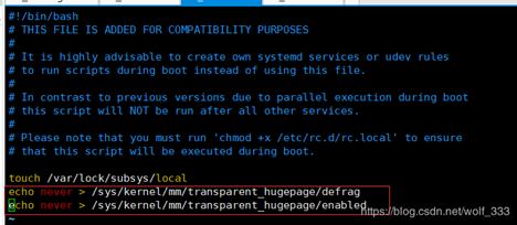 已启用透明大页面压缩,可能会导致重大性能问题。请运行“echo never > /sys/kernel/mm/transparent_hugepage/defrag”和“echo never > /sys/kernel/mm/transparent_hugepage/enabled”以禁用此设置,然后将同一命令添加到 /etc/rc.local 等初始化脚本中,以便在系统重启时予以设置。以下主机将受到影响: