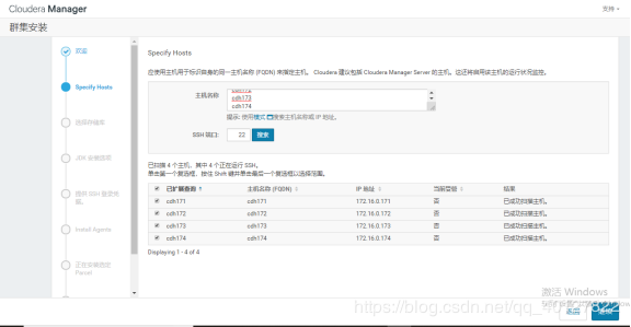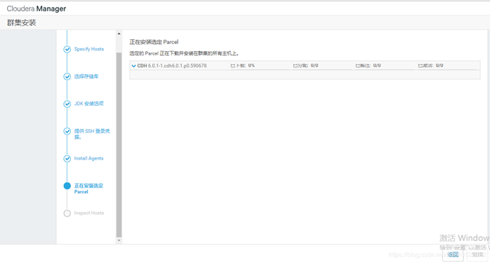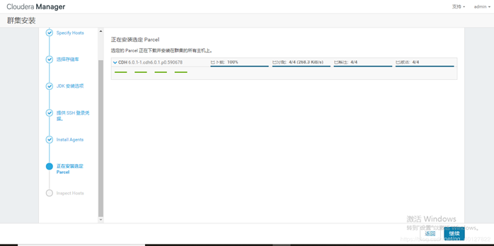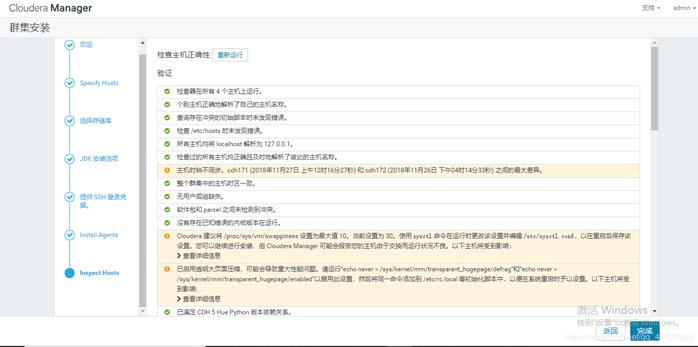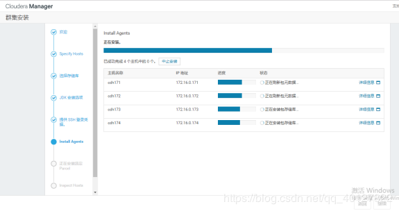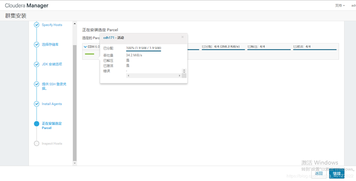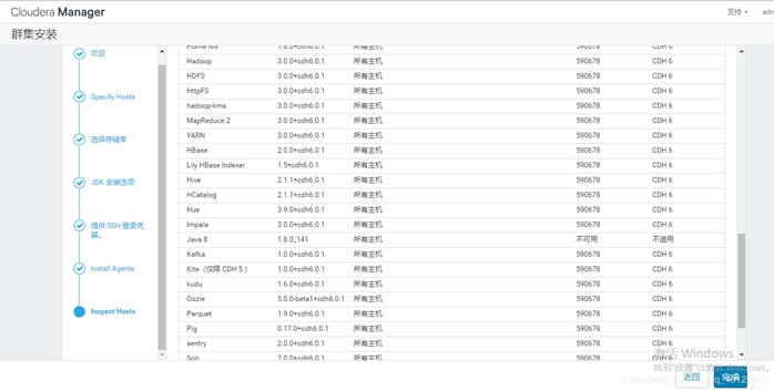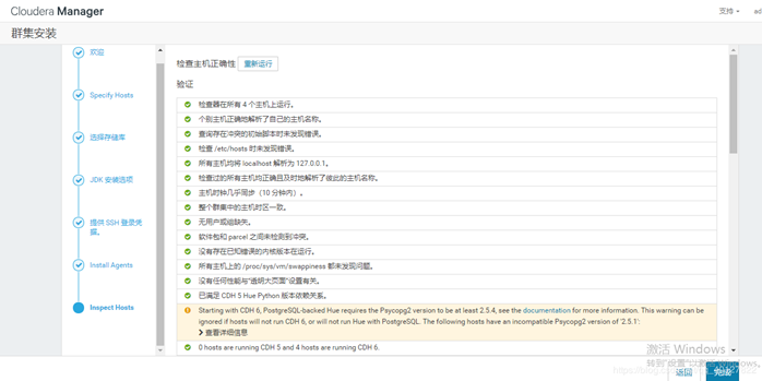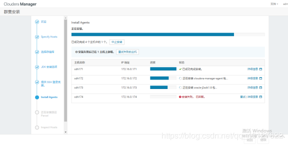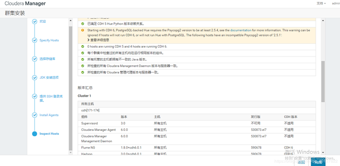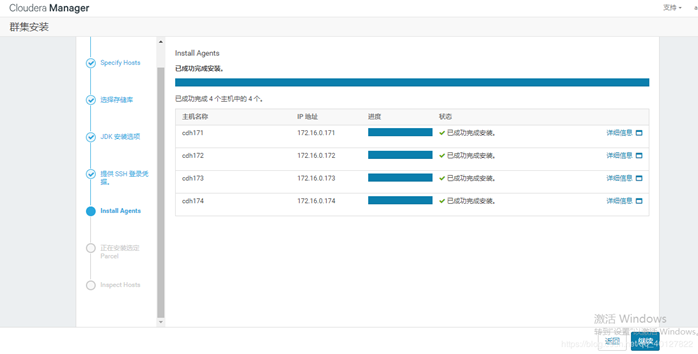最到考验网速的时候了,该页面使用js进行刷新,千万别手动刷新,手动刷新的话安装列表中之前已经功成的会消失,未成功的显示,未成功即使安装成功了,cm会管理不到之前已经成功但刷新后未显示的主机,在安装集群时只能选择本次显示的(原因未知)。网速过慢的话安装会失败,一定要耐心等待,别做无关操作。