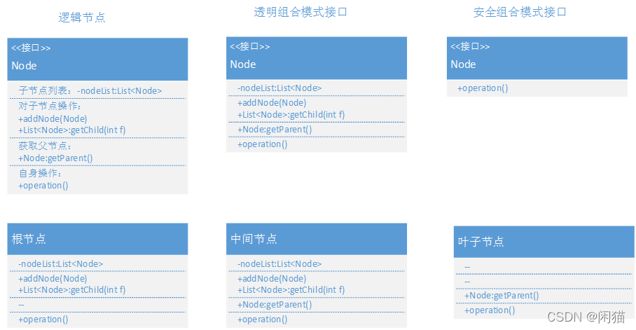 3. 完全组合模式:将有区别的操作方法声明放在抽象节点Node中,调用的时候自己区别对待。大家都实现一个接口,但叶子节点不包括:add/getChild方法,只有自己的方法。