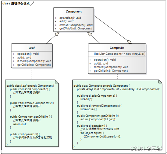 2. 透明组合模式:所有节点一样,都是大而全的方法集合,在子类中区别就是