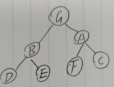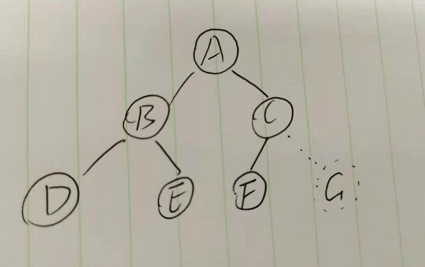 最后比较麻烦的就是在将G加入堆后,要按照大顶堆或者小顶堆排序,假设该堆是小顶堆,如果G的值小于C,那么需要交换C和G的位置,交互完后,G的父结点就是A,需要再比较G和A的大小,如果G小于A,要继续交换G和A的位置,最后的结果为: