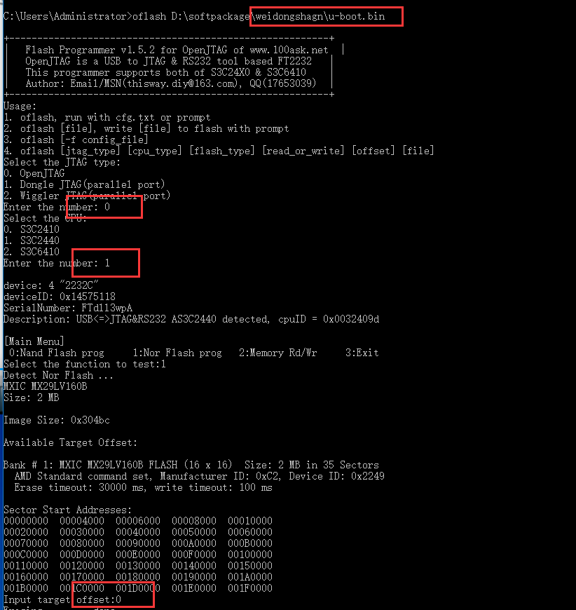 1. 把uboot 烧到 nor Flash , 拨打nor启动开关,打开串口工具, 上电, 按下空格 ,进入uboot 菜单选项